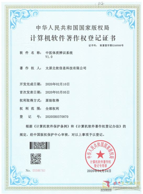 熱(rè)烈祝賀公司獲得(de)《中醫(yī)體(tǐ)質辨識系統》軟件(ji©©Ω÷àn)著作(zuò)權!