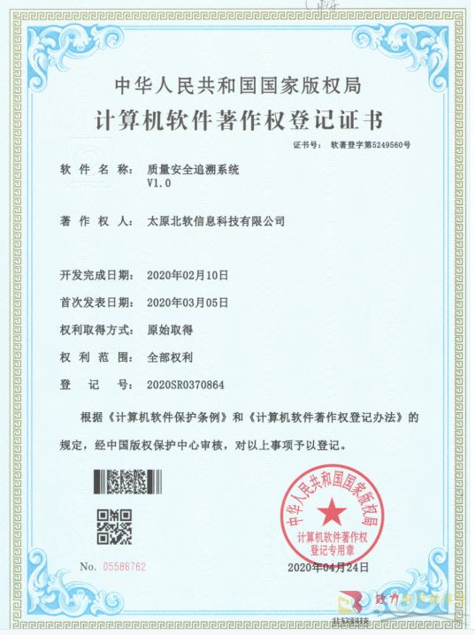 熱(rè)烈祝賀公司獲得(de)《質量安全追λ₽→¶溯系統》軟件(jiàn)著作(zuò)權!